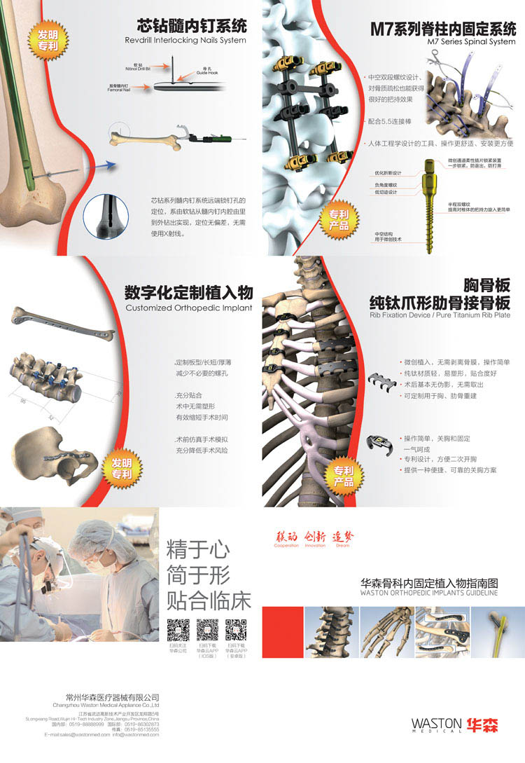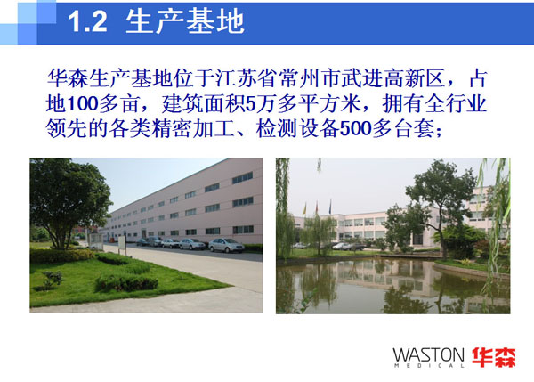華森醫(yī)療集團(tuán)是常州聯(lián)合工具集團(tuán)控股的,由常州華森醫(yī)療器械有限公司、常州華森生物科技有限公司、常州華森醫(yī)療科技有限公司、華森三家聯(lián)動科技創(chuàng)新中心、上海民衛(wèi)醫(yī)療器械有限公司等企業(yè)組成的集研發(fā)、制造、銷售、服務(wù)于一體的專業(yè)化醫(yī)療、健康產(chǎn)業(yè)集團(tuán)。 公司總部坐落于風(fēng)景秀麗的江南制造業(yè)基地——常州市武進(jìn)高新區(qū),西鄰常州飛機(jī)場,北靠滬寧高速公路,南依沿江高速公路,交通十分便利。 集團(tuán)核心成員——常州華森醫(yī)療器械有限公司是由常州聯(lián)合工具集團(tuán)和日本オーテー株式會社在2001年聯(lián)合投資5000萬人民幣成立的,專注于骨科、胸外科植入物等產(chǎn)品的開發(fā)、制造、營銷、服務(wù)的醫(yī)療器械專業(yè)廠家。自2001年成立以來已經(jīng)成為行業(yè)領(lǐng)先的和國內(nèi)最具活力的公司之一。 華森醫(yī)療公司采用事業(yè)部制管理結(jié)構(gòu),現(xiàn)公司下設(shè)為骨科事業(yè)部、吻合器事業(yè)部、手術(shù)工具事業(yè)部及胸外科產(chǎn)品事業(yè)部等四大事業(yè)部。主要生產(chǎn)三類6846骨科植入物及人工 、二類6801基礎(chǔ)外科手術(shù)器械、6825醫(yī)用高頻儀器設(shè)備、6808腹部外科手術(shù)器械及吻(縫)合器,專利爪型純鈦肋骨接骨板等產(chǎn)品。 公司三大生產(chǎn)基地占地面積100多畝,建筑面積35000多平方米,十萬級凈化車間2000多平方米。中高級以上職稱的研發(fā)、生產(chǎn)、質(zhì)控、管理人員占員工總?cè)藬?shù)的30%以上。公司設(shè)備精良,擁有包括德國DMG、CHIRON、美國HASS五軸加工中心、日本STAR縱切機(jī)床、SODICK慢走絲線切割在內(nèi)的著名品牌加工中心及其它高精密度機(jī)械加工設(shè)備一百多臺套,檢測設(shè)備齊全。公司與北京協(xié)和醫(yī)院,北京軍區(qū)總醫(yī)院,南京醫(yī)科大學(xué)、蘇州大學(xué)等著名醫(yī)院、學(xué)院進(jìn)行學(xué)術(shù)、技術(shù)聯(lián)盟,并依托兩大母公司的雄厚實力形成了強(qiáng)大的研發(fā)力量和生產(chǎn)能力。 華森公司為ISO13485:2003(YY/T0287-2003)國際質(zhì)量體系認(rèn)證企業(yè),所有產(chǎn)品全面通過歐盟CE認(rèn)證,其中華森吻合器已經(jīng)率先獲得了美國FDA510(K)認(rèn)證。經(jīng)過幾年的努力,華森WASTON品牌產(chǎn)品不僅出口到南美、中東、東南亞、東歐、北非等發(fā)展中國家,而且已經(jīng)開始進(jìn)入美國、法國、瑞士、德國、意大利、英國等歐美傳統(tǒng)發(fā)達(dá)國家。特別是與美國、歐洲的一些行業(yè)著名企業(yè)建立了合作聯(lián)盟關(guān)系,為華森產(chǎn)品達(dá)到或超過國際同類產(chǎn)品打下了堅實的基礎(chǔ)。 我們歡迎國內(nèi)外新老客商、朋友前來華森考察洽談、技術(shù)交流、合作合資,與華森公司共創(chuàng)美好明天。