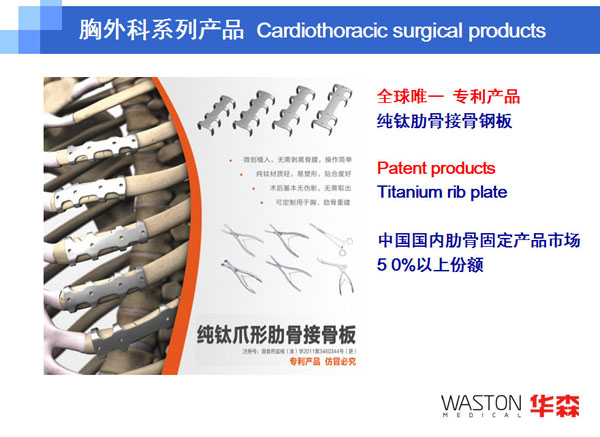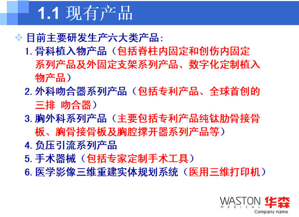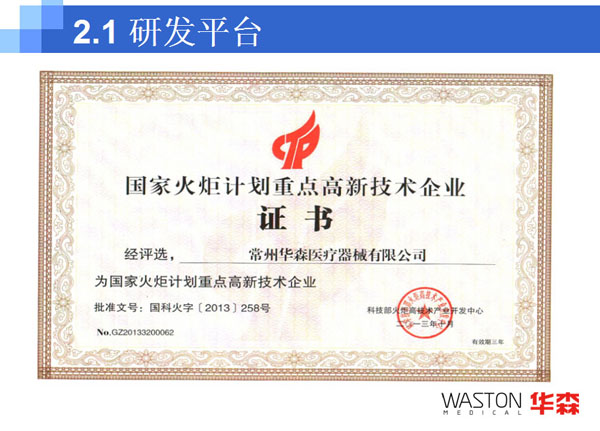 2009年:華森產(chǎn)品已經(jīng)覆蓋整個中國市場,建立起了一支由七大區(qū)域服務(wù)中心和兩百多家經(jīng)銷商組成的銷售服務(wù)網(wǎng)絡(luò);自有品牌WASTON骨科產(chǎn)品和吻合器產(chǎn)品已經(jīng)進(jìn)入30多個國家和地區(qū),特別是WASTON吻合器已經(jīng)進(jìn)入歐洲十多個發(fā)達(dá)國家;在OEM市場,華森已與包括全球前五位的獨(dú)立脊柱產(chǎn)品企業(yè)在內(nèi)的三十多家企業(yè)建立了合作生產(chǎn)關(guān)系;與海歸博士團(tuán)隊合作成立的常州華森生物科技有限公司正式成立;華森科技創(chuàng)新中心,即華森“三家聯(lián)動 科技創(chuàng)新”合作平臺正式成立;