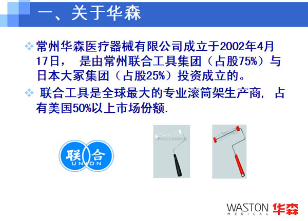 2001年:常州聯(lián)合工具集團(tuán)與日本オーテー株式會社在國家級常州高新技術(shù)區(qū)發(fā)區(qū)合資成立常州華森醫(yī)療器械有限公司,開始涉足醫(yī)療產(chǎn)業(yè),為集團(tuán)產(chǎn)業(yè)多元化奠定基礎(chǔ);