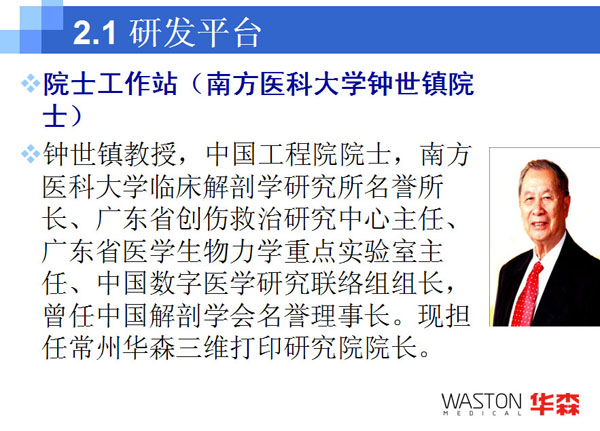 2010年:總額為兩千萬人民幣的二期設(shè)備投資已經(jīng)完成,其中包括更多的五軸加工中心、縱切機(jī)床、車削中心、慢走絲線切割等;與眾多醫(yī)學(xué)、材料學(xué)、力學(xué)等方面的專家以及多家科研機(jī)構(gòu)合作成立常州華森醫(yī)療科技有限公司;華森全球首發(fā)的專利“數(shù)字化定制植入物”經(jīng)過幾年攻關(guān)正式推向市場。