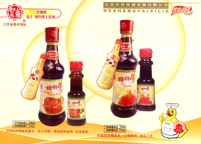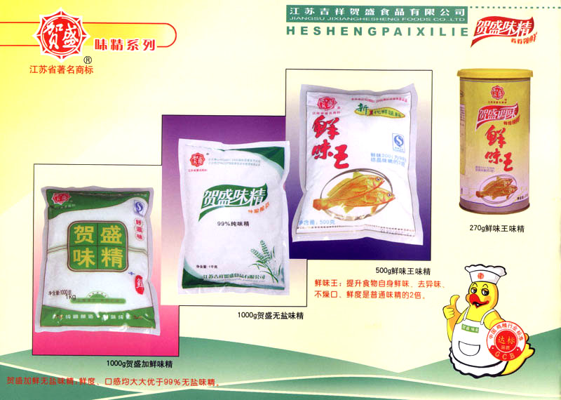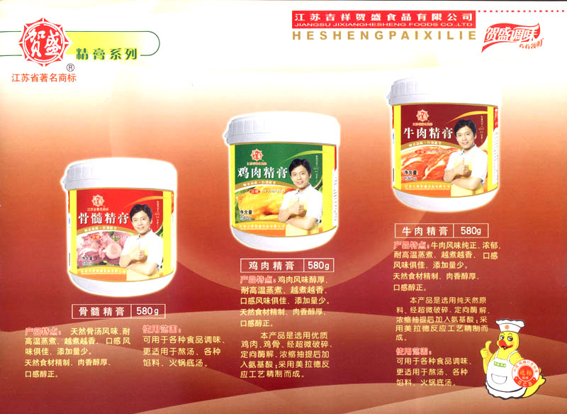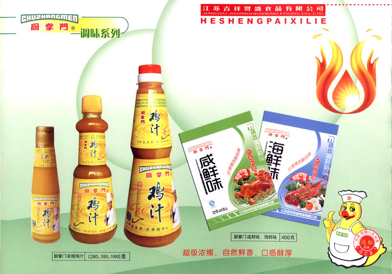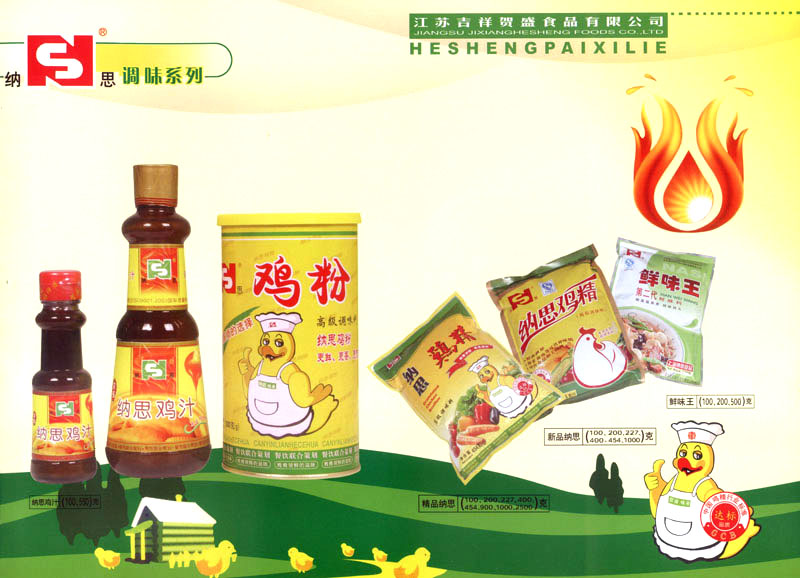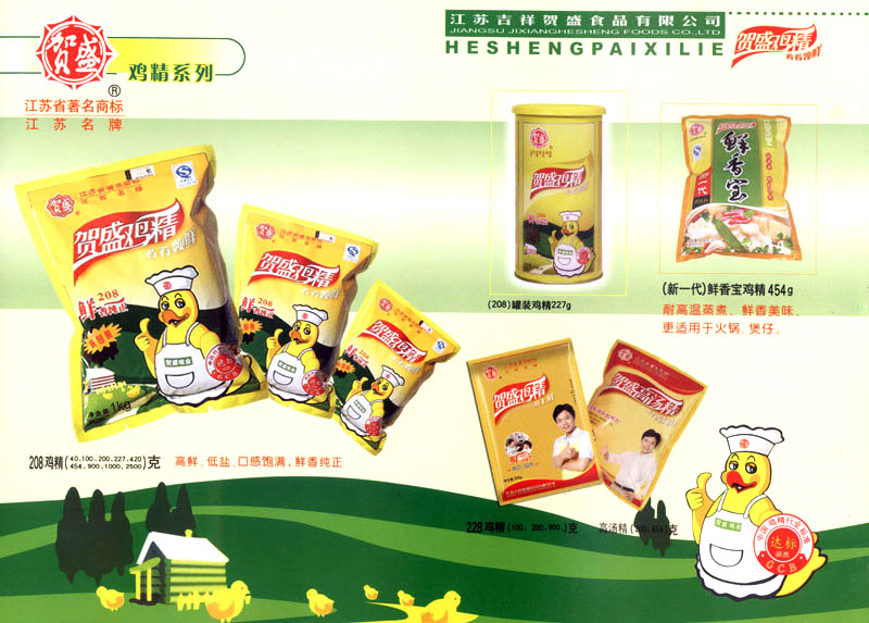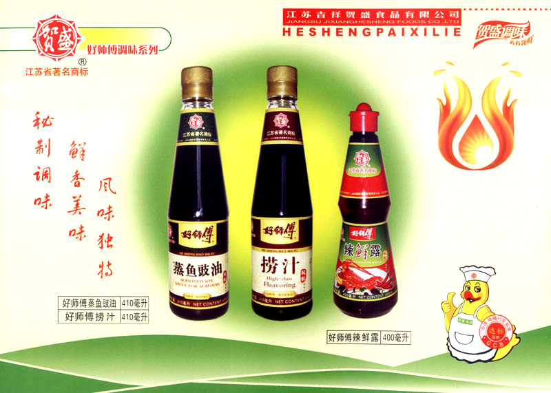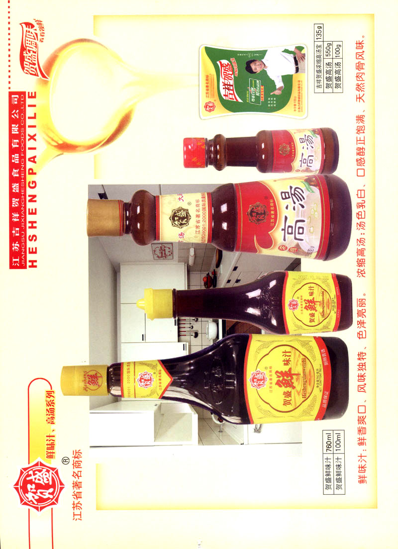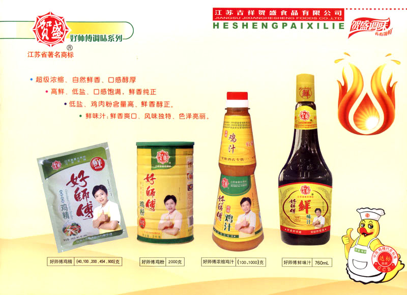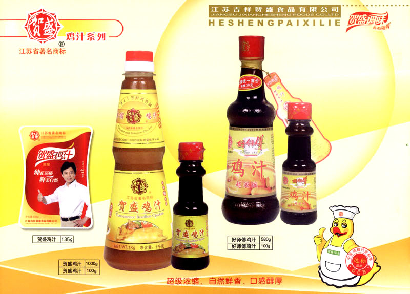 江蘇吉祥賀盛食品有限公司是一家中國專業(yè)餐料知名制造商,公司座落在經(jīng)濟(jì)高度發(fā)達(dá)“長三角”的常州市,緊靠312國道,滬寧高速與沿江高速交匯處,距常州火車站及長江水運碼頭20千米,交通十分便利。公司占地面積23500平方米,花園式工廠、廠房面積18500平方米,現(xiàn)在員工330余名,其中擁有中、高級職稱管理和技術(shù)人員58名,生產(chǎn)場地均按食品和藥品GMP要求設(shè)計、全封閉車間、中央空調(diào)系統(tǒng)、閉路電視監(jiān)控系統(tǒng)。目前已建成成三條雞精,雞粉生產(chǎn)線。一條雞汁生產(chǎn)線。一條鮮味汁生產(chǎn)線。一條醬汁精膏類生產(chǎn)線,規(guī)劃年生產(chǎn)能力達(dá)30000噸。 “賀盛”品牌取自《詩·大雅·下武》中“受天之祜、 四方來賀”;《易經(jīng)》中“富有謂之大業(yè),日新之謂盛德”,賀盛企業(yè)師法源遠(yuǎn)流長中華飲食文化,融匯中西健康美食調(diào)味。相繼研發(fā)生產(chǎn)出高品質(zhì)的“賀盛牌”味精、雞精、雞粉、雞汁、湯王、鮑魚醬王、鮮味汁調(diào)味素和各種風(fēng)味熱反應(yīng)精膏等系列產(chǎn)品。二十年來“賀盛”產(chǎn)品質(zhì)量獲得廚藝界專業(yè)人士和消費者的一致好評和高度認(rèn)可。 賀盛企業(yè)和產(chǎn)品相繼榮獲1995年“首界中國國際食品博覽會金獎”,2001年企業(yè)通過ISO-9001國際質(zhì)量體系認(rèn)證,2003年江蘇省“計量保證確認(rèn)單位”,2004年獲得自營出口權(quán),2005年賀盛雞精榮獲“江蘇名牌產(chǎn)品”,2006年賀盛商標(biāo)被評為“江蘇省著名商標(biāo)”,2007年通過HACCP認(rèn)證,全部產(chǎn)品均通過QS食品安全認(rèn)證,并積極努力爭創(chuàng)中國名牌,中國馳名商標(biāo)。 公司銷售網(wǎng)點建設(shè)發(fā)展迅速,相繼組建上海、南京、河南、海南、新疆全資分公司;辦事處、經(jīng)銷商覆蓋全國,并出口日本、香港及東南亞地區(qū)。二十年來,在公司總裁周國林先生帶領(lǐng)下,全體同仁秉承“厚德載物、自強不息”宗旨,發(fā)揚“以人為本、科技創(chuàng)新、自我加壓、爭創(chuàng)一流”的企求精神;致力于傳承中華飲食文化,融化西方美食精粹,不斷的研發(fā)、創(chuàng)新,奉獻(xiàn)更多更好的調(diào)味料,讓生活更有滋味。公司總裁周國林先生攜全體員工熱誠歡迎各位新老朋友蒞臨指導(dǎo),洽談合作!