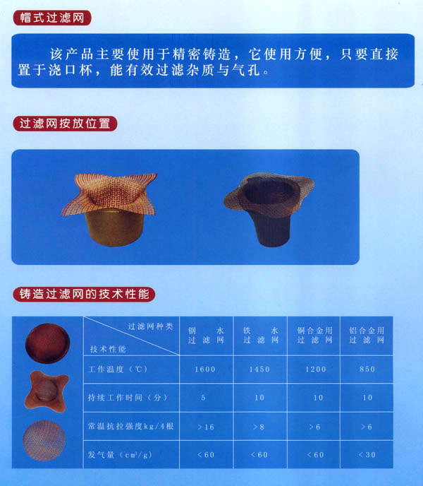 常州市猛將過濾網(wǎng)有限公司是專業(yè)生產(chǎn)系列鑄造過濾網(wǎng)的廠家。主要產(chǎn)品有:鐵水過濾網(wǎng)、鋼水過濾網(wǎng)、銅水過濾網(wǎng)、鋁水過濾網(wǎng)及熔模用帽式過濾網(wǎng)等。本廠產(chǎn)品是哈工大科研成果,榮獲國家經(jīng)委頒發(fā)的新技術(shù)成果獎。航天部科技進(jìn)步一等獎;中國質(zhì)量檢驗協(xié)會授予“猛將”牌高硅氧過濾網(wǎng)“國家權(quán)威檢測達(dá)標(biāo)產(chǎn)品”榮譽(yù)證書;我廠生產(chǎn)的“四角帽式過濾網(wǎng)”獲國家專利局外觀設(shè)計專利證書;并獲香港國際新技術(shù)新產(chǎn)品博覽會“金獎證書”。2002年獲亞洲國際新技術(shù)新產(chǎn)品博覽會“科技發(fā)明進(jìn)步獎”,2002年本廠所生產(chǎn)的“四角帽式過濾網(wǎng)在首屆“金艦杯”國際新技術(shù)成果網(wǎng)絡(luò)交易會活動中成績顯著,被評為金杯獎。同年在日內(nèi)瓦國際專利技術(shù)成果博覽會中被評為國際優(yōu)秀專利金獎。目前,本廠產(chǎn)品銷往全國各省、市、自治區(qū),是國內(nèi)銷量最大的廠家之一。同時出口韓國、泰國、東南亞等國家。進(jìn)入21世紀(jì)以來,我國加入WTO后,我廠在哈工大葉榮茂教授的指導(dǎo)下,開發(fā)研制出一種多孔泡沫陶瓷過濾網(wǎng),該產(chǎn)品兼具玻璃纖維過濾網(wǎng)和直孔過濾網(wǎng)的篩分夾渣功能,且更具有吸附微小夾渣氧化物的功能。多孔泡沫陶瓷過濾網(wǎng)的主要工作原理是讓紊亂、翻騰的(TV urbuItnt Flow)金屬液經(jīng)過產(chǎn)品形成平穩(wěn)、均勻(SmoothFlow)的金屬液,金屬液經(jīng)過復(fù)雜的多孔泡沫陶瓷過濾網(wǎng),能有效地吸附截留微小氧化夾渣物,并溢除氣泡,然后能使鑄件產(chǎn)品達(dá)到純潔度高、強(qiáng)度高、韌性好、機(jī)械加工性能好等特點(diǎn),從而能夠降低生產(chǎn)成本,提高產(chǎn)品成品率,增加經(jīng)濟(jì)效益。我廠熱忱歡迎廣大用戶使用該產(chǎn)品。 我公司設(shè)計發(fā)明的“四角帽式過濾網(wǎng)”,已在2001年3月申請專利,并于當(dāng)年11月底經(jīng)中華人民共和國知識產(chǎn)權(quán)局授權(quán)公告。頒布了外觀設(shè)計專利證書,證書號第207620號,F(xiàn)有個別廠家悍然侵權(quán),公然在有關(guān)鑄造媒體打出侵權(quán)產(chǎn)品廣告。對此,我們鄭重聲明,要求侵權(quán)廠家盡快采取糾正措施,為了維護(hù)我們的知識產(chǎn)權(quán),我們不排除采取法律行動的可能。