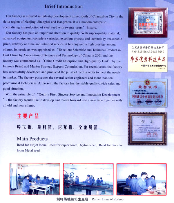 漕橋紡織器材廠位于常州市南郊寧、滬、杭金三角漕橋工業(yè)開(kāi)發(fā)區(qū),是全國(guó)專業(yè)生產(chǎn)鋼筘規(guī)模較大的現(xiàn)代化廠家,已具有20年的歷史。 本廠生產(chǎn)的鋼筘有噴氣、劍桿筘、尼龍?bào)亍A織機(jī)筘和金屬筘分鉸筘、織帶筘、無(wú)梭織帶筘……本廠特別擅長(zhǎng)生產(chǎn)高密度的劍桿筘。 本廠素以質(zhì)量為重,均采用優(yōu)質(zhì)材料制筘,如噴氣筘使用的筘片膠水鋁架等,均采用日本進(jìn)口的材料;劍桿筘筘片采用日本進(jìn)口的57B線材,膠水均采用紡織部定點(diǎn)的陜西紡織研究所生產(chǎn)的優(yōu)質(zhì)膠水、高密度劍桿筘均用進(jìn)口膠水制筘;全金屬筘均用云南的優(yōu)質(zhì)錫制筘。 各種鋼筘筘面的平整度,筘齒的均勻度、垂直度,筘片的彈性度,膠水的牢固度廣大用戶使用后感到滿意放心,特別是使用壽命特別長(zhǎng),受到用戶一致的盛贊,真是料好筘好,筘好布好。 本廠為了使質(zhì)量精益求精,增添了不少先進(jìn)設(shè)備,并聘請(qǐng)了數(shù)名高級(jí)工程師和十多位具有專業(yè)知識(shí)的技術(shù)人員把關(guān)。由于質(zhì)量穩(wěn)定可靠,2001年被中國(guó)科學(xué)技術(shù)協(xié)會(huì)評(píng)為“華東優(yōu)秀科技產(chǎn)品”二00二年被中國(guó)管理科學(xué)研究院名牌與市場(chǎng)戰(zhàn)略專家委員會(huì)評(píng)為“中國(guó)誠(chéng)信企業(yè)質(zhì)量達(dá)標(biāo)單位”。 今本廠產(chǎn)品暢銷(xiāo)全國(guó)20多個(gè)省市,價(jià)格優(yōu)惠,供不應(yīng)求,形勢(shì)喜人。 本廠本著“以質(zhì)取勝、誠(chéng)信服務(wù)、創(chuàng)新發(fā)展”的宗旨,愿與廣大新老客戶攜手共肩,昂首走進(jìn)新時(shí)代,迎接新的挑戰(zhàn)。