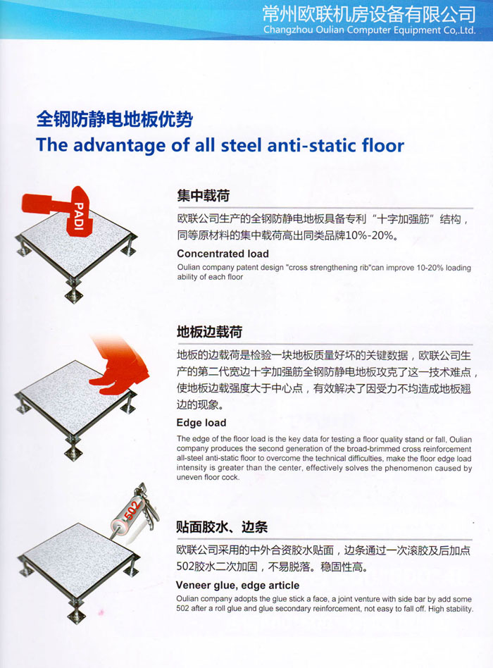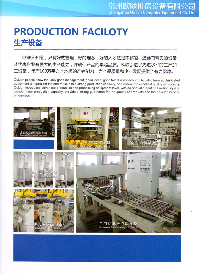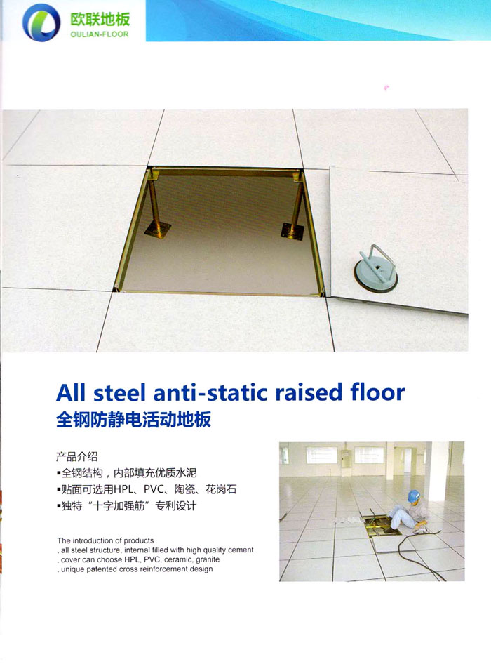防靜電高架活動(dòng)地板、全鋼地板、陶瓷地板是計(jì)算機(jī)行業(yè)發(fā)展起來的新型鋪地材料,隔離了潮氣、靜電灰塵,最重要的是解決了綜合布線問題,無需預(yù)埋管線,可隨時(shí)拆卸、搬移,保證了資訊設(shè)備完整的優(yōu)點(diǎn),適應(yīng)了智能化樓宇中信息自動(dòng)化技術(shù)對(duì)所處環(huán)境的特定要求,避免了廣大客戶的雙重投資,使現(xiàn)代化辦公程度更加高效,辦公場(chǎng)所更加舒適。 “歐聯(lián)”系列全鋼地板,符合國家安全要求,種類完備多樣,其中防靜電陶瓷地板、硫酸鈣地板等除具有普通瓷質(zhì)的裝飾和實(shí)用性外,其耐磨、防水、防火功能優(yōu)于其它同類產(chǎn)品,防靜電系列地板,能切合不同客戶的要求,其靈活的配置,深受客戶歡迎,不同材質(zhì)的地板結(jié)構(gòu)使設(shè)計(jì)師的設(shè)計(jì)空間比傳統(tǒng)的更加廣闊自由和善變。 公司大力發(fā)展國內(nèi)外銷售業(yè)務(wù),多次中標(biāo)國內(nèi)重點(diǎn)工程 ,例:哈爾濱醫(yī)科大學(xué)、山東大學(xué)、上海普通機(jī)場(chǎng)等。 公司將一如既往開發(fā)和制造一流的產(chǎn)品,愿與廣大有識(shí)之士合作發(fā)展,共創(chuàng)美好未來。