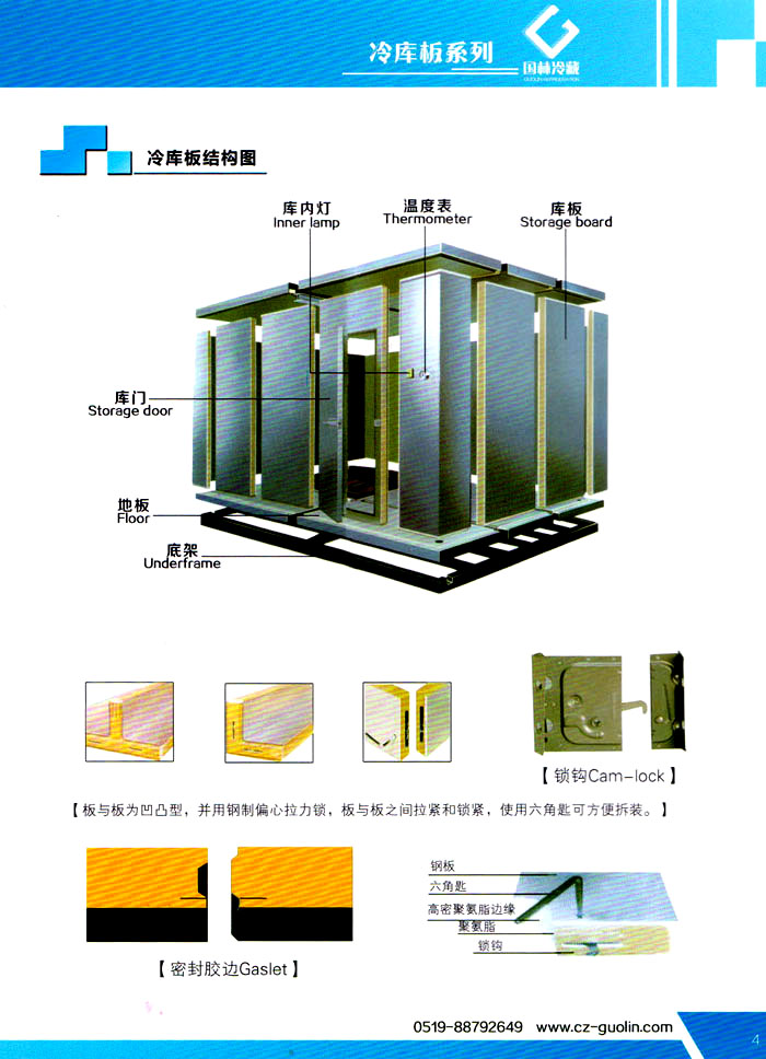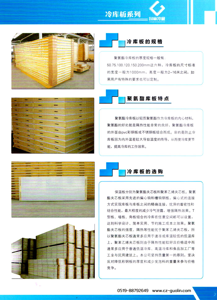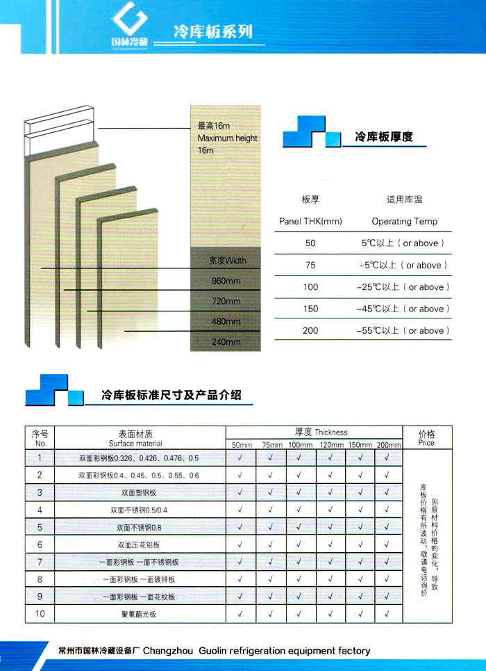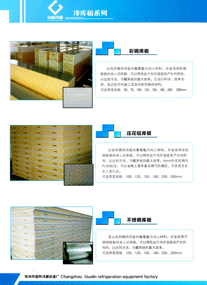 常州市國林冷藏設備廠(原武進長虹冷藏設備廠)成立于1995年,地處江南水鄉(xiāng)中國富饒的“長江三角洲”中心區(qū)域—江蘇常州,滬寧高速、沿江高速、312國道,交通快捷,即刻到達。 國林冷庫:公司通過了ISO9001:2000質(zhì)量體系認證,國林冷庫多次獲得“江蘇省優(yōu)質(zhì)產(chǎn)品”稱號,全國質(zhì)量服務AAAAA示范單位,并且是中國食品網(wǎng)、阿里巴巴,空調(diào)制冷誠信通會員企業(yè),并與全國多家設計院技術(shù)合作,本廠的誠信服務獲得了廣大客戶的認可。 國林冷庫:中國制冷行業(yè)的十大冷庫制造商之一,中國制冷重要工業(yè)生產(chǎn)基地。本公司***生產(chǎn)保溫庫板及冷庫制冷成套設備,庫板材料涉及不銹鋼、彩鋼板、玻璃鋼板、保溫聚氨脂板。年產(chǎn)量3000多臺,庫板30多萬平方,歡迎新好客戶前來訂購。 國林制冷:公司始終堅持:“質(zhì)量為上,追求品質(zhì)”的生產(chǎn)方針;始終信奉:“客戶為先,服務為本”的經(jīng)營理念。我們愿同廣大的新老客戶在新的世紀里,共同發(fā)展,利益雙贏,再創(chuàng)輝煌。 常州市國林冷藏設備廠***生產(chǎn)7.5公分,10公分,12公分,15公分,20公分的聚氨酯冷庫板,面板包括彩鋼板、不銹鋼板、壓花鋁板等各種板材,各種冷庫半埋門及平移動門,各種鐵排管和鋁排管,價格優(yōu)惠,有需要的可以聯(lián)系我金文燁18761183807