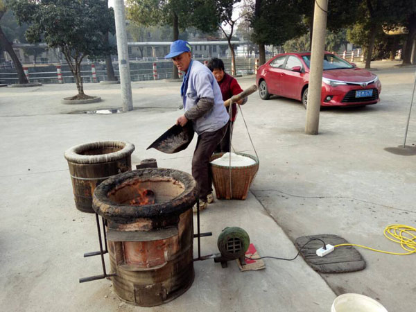 第一步:蒸糯米飯,老徐先用煤爐將水燒開,再將洗凈泡好的糯米放入一只大木桶中,放在爐子上蒸。除此以外,老徐還要不斷攪拌,保證糯米受熱均勻,直至散發(fā)出水蒸氣。為了保證米飯溫度,老徐特地用塑料薄膜將木桶封住,并用皮筋加固。蒸糯米飯,大約需要半個多小時。
