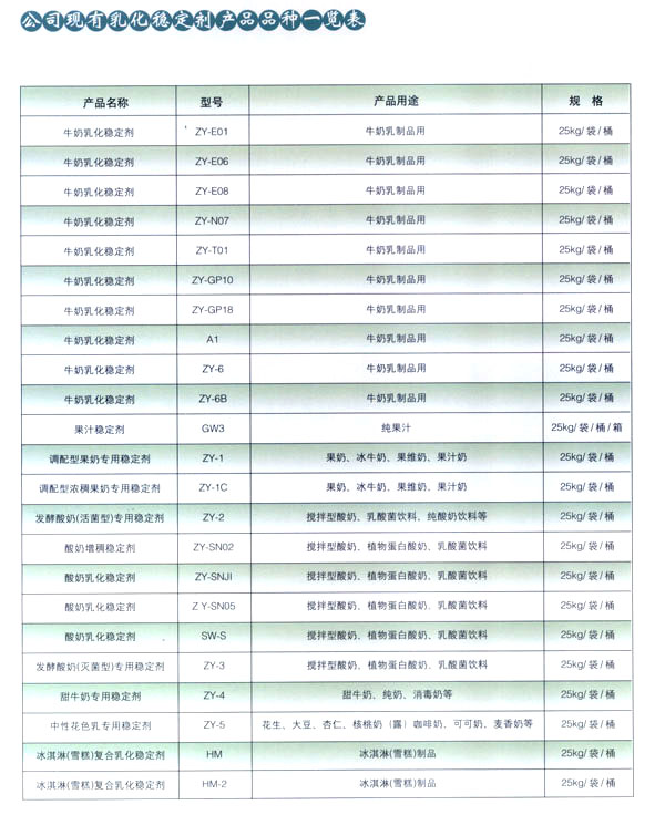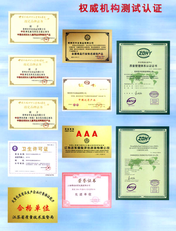 常州市中友食品有限公司;匚挥诔V菔袞|郊開發(fā)區(qū),廠房占地面積6000平方米,擁有全新的生產(chǎn)線,先進(jìn)的生產(chǎn)流程和嚴(yán)格的質(zhì)量管理體系(工廠已通過IS09001:2000質(zhì)量管理體系的認(rèn)證)。并有專業(yè)的技術(shù)開發(fā)和理化檢驗(yàn)的設(shè)施、經(jīng)驗(yàn)豐富的技術(shù)人員。公司以科技為依托,常年與高等院校合作,不斷地開發(fā)和研制適合市場需求的食品添加劑系列產(chǎn)品。公司每年面向全國招收優(yōu)秀的博士、碩士及優(yōu)秀的大學(xué)生。公司現(xiàn)有員工1 00多人,管理人員2 0名、高工5名、產(chǎn)品專業(yè)技術(shù)開發(fā)人員12名,還有選擇地引進(jìn)和代理國內(nèi)外各種適用的食品添加劑。 依靠本公司雄厚的科技力量和先進(jìn)的科技設(shè)備,生產(chǎn)基地已經(jīng)具備了與客戶共同開發(fā)國內(nèi)外先進(jìn)食品添加劑的應(yīng)用技術(shù)。博適中友公司多年來致力于食品添加劑的研究和開發(fā),突破常規(guī)理念,以市場、用戶為中心,研究開發(fā)各個(gè)品種、各個(gè)檔次的食品添加劑,品種齊全又多樣,既有出口型又有內(nèi)銷型。公司主要穩(wěn)定劑產(chǎn)品有:乳飲料乳化穩(wěn)定劑、乳酸飲料乳化穩(wěn)定劑、冰淇淋(雪糕)復(fù)合乳化穩(wěn)定劑、果汁飲料乳化穩(wěn)定劑等,產(chǎn)品暢銷國內(nèi)外,覆蓋了全國二十多個(gè)省市,并建立了穩(wěn)定的銷售網(wǎng)絡(luò)。 本公司對(duì)產(chǎn)品指定了嚴(yán)格的質(zhì)量標(biāo)準(zhǔn),并報(bào)請(qǐng)常州市技術(shù)檢驗(yàn)監(jiān)督局審核批準(zhǔn),其技術(shù)要求完全符合GB一2760(食品添加劑使用衛(wèi)生標(biāo)準(zhǔn))和符合聯(lián)合國直接衛(wèi)生組織(WHO)、聯(lián)合國食品與農(nóng)業(yè)組織(FAO)以及美國食品和藥物管理局的有關(guān)規(guī)定。 長期以來,博適中友公司以市場定位為基本依據(jù),堅(jiān)持發(fā)展并開辟多元化的國內(nèi)外市場:以專業(yè)化、長遠(yuǎn)化、規(guī)模化為經(jīng)營思路:以開拓創(chuàng)新,務(wù)實(shí)誠信為經(jīng)營理念,不斷促進(jìn)企業(yè)發(fā)展壯大。 公司自創(chuàng)建以來,始終不渝地堅(jiān)持質(zhì)量第一、信譽(yù)至上,以精湛的工藝加工產(chǎn)品,不管是標(biāo)準(zhǔn)的或特制的都可享有本公司優(yōu)良的技術(shù)服務(wù)。無論您需要何種功能性添加劑,博適中友食品添加劑公司均能滿足您的要求。博適中友公司以價(jià)格合理、服務(wù)周到為經(jīng)營宗旨,努力引導(dǎo)食品添加劑應(yīng)用發(fā)展的新潮流、新方向。在才能卓越的領(lǐng)導(dǎo)者的帶領(lǐng)下,全體員工以開拓、創(chuàng)新、求實(shí)、守信為企業(yè)精神,不斷地提高自身的素質(zhì)。 公司的宗旨是“開拓創(chuàng)新發(fā)展、精誠服務(wù)和諧”為目標(biāo),熱忱與各界有識(shí)之士攜手共進(jìn),共創(chuàng)輝煌!如今公司業(yè)務(wù)蒸蒸日上,專業(yè)技術(shù)研究越走越精,這都與廣大客戶大力支持分不開。在新世紀(jì)來臨之際,上海博適中友公司愿與您真誠合作,攜手并進(jìn),共鑄新的輝煌!