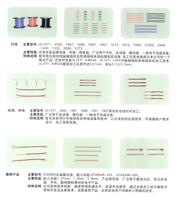 常州市匯創(chuàng)電子有限公司我公司2000年8月成立.端子連接線(xiàn)生產(chǎn)有10余年的經(jīng)驗(yàn).結(jié)合韓國(guó)連接線(xiàn)生產(chǎn)技術(shù),致力于筆記本電腦,手機(jī),數(shù)碼相機(jī)等高端行業(yè)的小間距的端子連接線(xiàn)的研究和生產(chǎn).小間距端子連接線(xiàn)的插頭的常規(guī)型號(hào)有 SH/1.0mm, 51021-0200/1.25mm, ZH , PH, EH, XH, SAN, SCN, 2510 等.特殊插頭型號(hào)有:02SUR-32S,02SSR-32H.材料用原廠(chǎng)進(jìn)口的JST, MOLEX,或臺(tái)資廠(chǎng)家的(根據(jù)客戶(hù)需要).全環(huán)保,無(wú)鉛化生產(chǎn).2008年開(kāi)始導(dǎo)入無(wú)鹵素要求。企業(yè)已經(jīng)通過(guò)ISO9001-2000質(zhì)量管理體系.質(zhì)量好!交貨快!價(jià)格合理!是目前常州AAC等多家大型受話(huà)器廠(chǎng)家的優(yōu)秀供應(yīng)商.客戶(hù)遍及常州周邊,蘇州,昆山,上海,深圳,嘉興,山東,重慶等地.也有直接出口韓國(guó),臺(tái)灣.現(xiàn)有高素質(zhì)員工100人左右.廠(chǎng)房面積2000平方米.