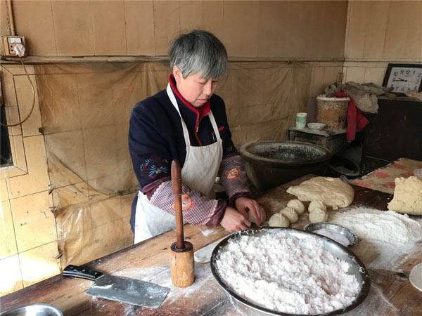每天凌晨一兩點鐘,沈國平就要去采買當(dāng)天最新鮮的豬板油,回來清理干凈,和上面粉攪拌均勻,制成面團。麻糕的制作主要由沈國平妻子和兩個姊妹來完成。揉面、搓胚子、配油酥,按餡心、搟均勻,整個過程行云流水,連貫無比。