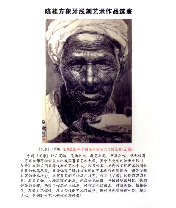 陳桂方,江蘇常州武進(jìn)人,中國著名雕刻藝術(shù)家,江蘇省工藝美術(shù)大師、研究員級、高級工藝美術(shù)師,江蘇省非物質(zhì)文化遺產(chǎn)《象牙淺刻》代表性傳承人。畢業(yè)于中國書畫函授大學(xué),深造于清華大學(xué)、南大美術(shù)系,現(xiàn)任中國工藝美術(shù)協(xié)會會員,江蘇省工藝美術(shù)學(xué)會理事,常州市工藝美術(shù)家協(xié)會副秘書長,常州市工藝美術(shù)行業(yè)協(xié)會常務(wù)理事,武進(jìn)工藝美術(shù)協(xié)會副主席。陳桂方大師淺刻作品的藝術(shù)特點:山水氣韻生動,氣勢磅礴,場面壯觀,刀法細(xì)膩:人物仕女生動可人,栩栩如生,充分表達(dá)體現(xiàn)了中國象牙工藝獨具的內(nèi)在文化底蘊和現(xiàn)代社會的審美觀念及獨特的淺刻藝術(shù)表現(xiàn)技藝。對每件藝術(shù)作品創(chuàng)作都精益求精,強(qiáng)調(diào)藝術(shù)創(chuàng)作的思想性、意境及內(nèi)涵。注重章法構(gòu)思,掌握牙刻藝術(shù)的特性表現(xiàn),作品具有鮮明生動的時代氣息,獨具所創(chuàng)工筆與寫意相結(jié)合的牙刻藝術(shù)表現(xiàn)手法和表現(xiàn)形式,出眾、飄逸、多變的刀法技藝,粗獷處見細(xì)微、方寸間見大觀的創(chuàng)作理念深受專家權(quán)威的肯定和業(yè)內(nèi)人士的一致好評。陳桂方大師至企頑事象牙淺刻藝術(shù)創(chuàng)作近四十余載,完善了自己的創(chuàng)作體系,成就了自己獨特的藝術(shù)風(fēng)格。作品數(shù)年來連續(xù)二十多次榮獲國家最高藝術(shù)精品大獎《金獎》,象牙淺刻作品《李逵探母》已被國家工藝美術(shù)館收藏,并頒發(fā)了國家收藏證書,在全國數(shù)十年間尚屬首次。當(dāng)前,陳桂方牙刻藝術(shù)作品已深受廣大海內(nèi)外業(yè)內(nèi)人士、收藏家們的鐘愛、青睞、熱藏,并被譽為當(dāng)代最杰出最具潛質(zhì)的實力派藝術(shù)大師。