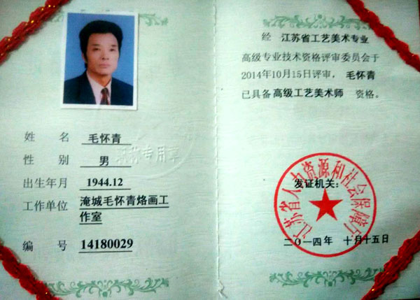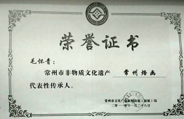 毛懷青,江蘇常州市武進(jìn)人。 中國工藝美術(shù)學(xué)會會員,常州市中國烙畫研究會副會長,常州市文博鑒賞協(xié)會理事,非物質(zhì)文化遺產(chǎn)烙畫傳承人。高級工藝美術(shù)師。 年輕時學(xué)習(xí)國畫、油畫中年蔓現(xiàn)掌州咯畫源遠(yuǎn)流長、歷史悠久,有著其它美術(shù)門類不具備的藝術(shù)風(fēng)格與特色?芍^是工藝美術(shù)中的一朵十分亮麗的藝術(shù)奇葩,是我民族先人給我們留下的一份不可多得十分珍貴的一份文化遺產(chǎn)。為弘揚(yáng)與發(fā)展這份優(yōu)秀文化遺產(chǎn),我從此下定決心研究烙畫,愿付出一份力量為振興烙畫事業(yè)做出貢獻(xiàn)。至今已潛心研究幾十年,取得了可喜的成績,被業(yè)界公認(rèn),社會關(guān)注與認(rèn)可。有“江南烙畫第一筆”之美譽(yù)。 近年來,創(chuàng)作的烙畫作品分別獲得過全國、省市級的金、銀、銅獎多次。中央電視臺曾兩次播放過本人的烙畫作品,江蘇電視臺、常州電視臺也曾多次播放過本人的作品與烙畫藝術(shù)生涯,揚(yáng)子晚報(bào)、常州日報(bào)、常州晚報(bào)也曾多次報(bào)導(dǎo)過本人的烙畫作品,出版物有三種版本都能查閱到介紹本的烙畫從藝生涯與藝術(shù)業(yè)績。