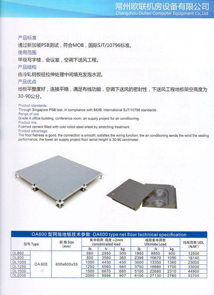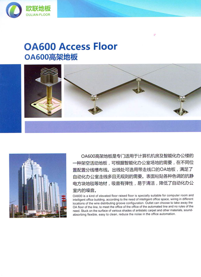 防靜電高架活動地板、全鋼地板、陶瓷地板是計算機行業(yè)發(fā)展起來的新型鋪地材料,隔離了潮氣、靜電灰塵,最重要的是解決了綜合布線問題,無需預(yù)埋管線,可隨時拆卸、搬移,保證了資訊設(shè)備完整的優(yōu)點,適應(yīng)了智能化樓宇中信息自動化技術(shù)對所處環(huán)境的特定要求,避免了廣大客戶的雙重投資,使現(xiàn)代化辦公程度更加高效,辦公場所更加舒適。 “歐聯(lián)”系列全鋼地板,符合國家安全要求,種類完備多樣,其中防靜電陶瓷地板、硫酸鈣地板等除具有普通瓷質(zhì)的裝飾和實用性外,其耐磨、防水、防火功能優(yōu)于其它同類產(chǎn)品,防靜電系列地板,能切合不同客戶的要求,其靈活的配置,深受客戶歡迎,不同材質(zhì)的地板結(jié)構(gòu)使設(shè)計師的設(shè)計空間比傳統(tǒng)的更加廣闊自由和善變。 公司大力發(fā)展國內(nèi)外銷售業(yè)務(wù),多次中標(biāo)國內(nèi)重點工程 ,例:哈爾濱醫(yī)科大學(xué)、山東大學(xué)、上海普通機場等。 公司將一如既往開發(fā)和制造一流的產(chǎn)品,愿與廣大有識之士合作發(fā)展,共創(chuàng)美好未來。