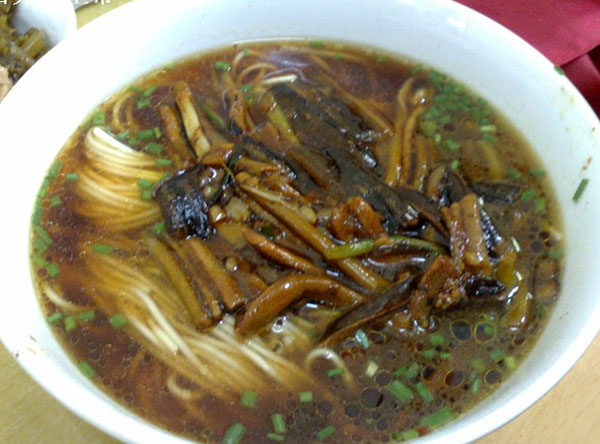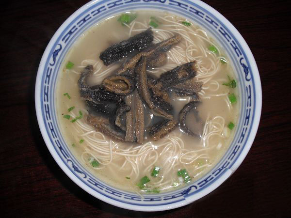 常州新北區(qū)孟河公陽小吃店從事鱔絲面23年,經(jīng)營面積100平方米,黃鱔全是野生,面湯采用高湯制作(鱔魚湯),下面的時候先用開水把黃鱔燙熟,然后用竹刀批下二條黃鱔肉,除去骨頭肚腸,切成段后入油鍋里炸酥,再用白湯烹制成為面澆頭。而面湯是用鱔魚骨頭、豬骨等用大鍋猛火煮上三、四個鐘頭,成為一鍋濃濃的白湯,再進行調(diào)味,吃到嘴里全身舒坦。