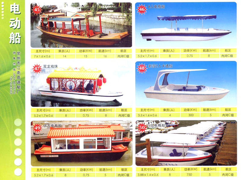 隨著人民生活的提高和水上旅游業(yè)的不斷發(fā)展,原有的游艇已遠不能滿足人民群眾不斷提高的需求。為適應水上旅游業(yè)市場的變 化,我廠開發(fā)研制了符合中國國情、具有民族特色的仿古畫舫游艇及國際最新流行款式一城市旅游休閑觀光艇。特別近兩年又開發(fā)了一批精品畫舫船投放市場之后深受景區(qū)的歡迎。今年我廠又開發(fā)了適用少數(shù)民族的“風雨橋”、“寨門”畫舫艇。在湖南、廣西、云南、貴州深受愛戴。此艇別具風格,民族風情特別濃厚。侗鄉(xiāng)一號計劃在2006年5月1日投放在貴州黎平侗鄉(xiāng)風景區(qū)八舟河景區(qū)使有(風序號)。我廠歡迎用戶來圖加工,來廠考察訂貨,畫舫艇款式多多,終有一款適合你。歡迎來電來函垂詢。索樣即寄。誠心銷售、人情化服務、企業(yè)文化、精品畫舫。