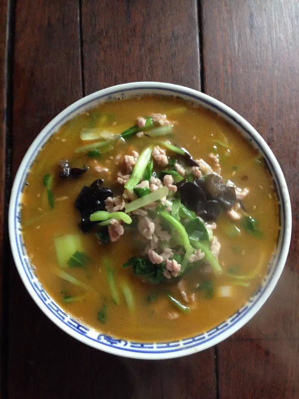 武進(jìn)區(qū)青城面館經(jīng)營面積280平方米左右,主要特色是現(xiàn)炒肉絲,素菜蓋澆面,面館創(chuàng)始人今年63歲的王蘭珍,她對(duì)美食有著高于常人的悟性。她開過饅頭店,開過小飯館,承包過食堂,燒菜、取料樣樣在行,吃過的人常常贊不絕口。 20世紀(jì)初,在跟德興面館的老師傅學(xué)了做面手藝后,王蘭珍萌生了開一家面館的想法,除了可以養(yǎng)家糊口,最重要的是想讓更多人嘗嘗自己的手藝。于是,她在自己的住處擺起了幾張桌椅,面館就算正式營業(yè)了。因?yàn)榧易∏喑菢,王蘭珍干脆取名“青城面館”。 “從早上5點(diǎn)多開始營業(yè),到下午1點(diǎn)多打烊,一天至少要賣掉300多碗面,用掉近160斤面粉!睘楹吻喑敲骛^的面條如此受歡迎,兒媳婦陸偉紅說秘訣在于湯頭和澆頭。湯頭分白湯和紅湯,白湯是由10斤豬骨頭熬制而成,湯色清澈而味道濃郁;紅湯以骨頭湯作底湯,加入茴香、甘草、草果等20多種中草藥,以及糖、醬油等調(diào)味品,鮮而不腥,散發(fā)出陣陣香味。 和一般面館事先燒制好澆頭,放在盆里供客人選擇不同,青城面館的澆頭都是一份份現(xiàn)炒的,特別講究食材的新鮮。就拿暢銷的肉絲蔬菜紅湯面來說,要先起猛火,把肉絲、木耳、蘑菇、青菜等食材放一起煸炒至香,然后澆在撈起的面條上。一碗面出來,現(xiàn)炒的澆頭與面條融合,味道香郁至極。 遙觀人的早晨,醒得有些早。對(duì)很多遙觀人來說,美好的一天是從青城面館開始的。那一碗碗現(xiàn)炒的蓋澆面,筋道爽滑、醬香味濃,溫存著他們的胃與記憶,帶來刻進(jìn)骨子里的家鄉(xiāng)味道。