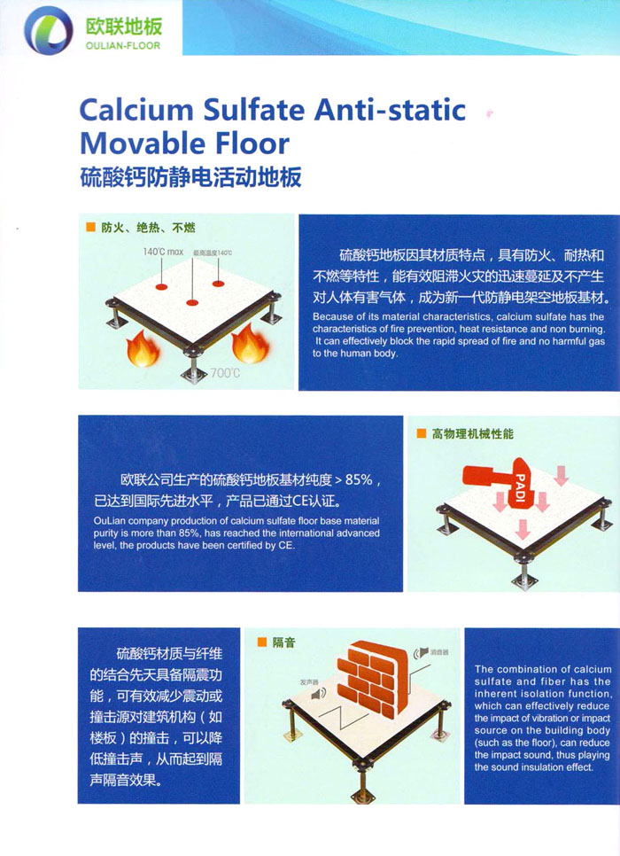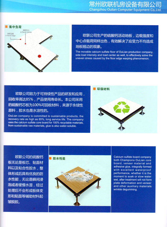 防靜電高架活動(dòng)地板、全鋼地板、陶瓷地板是計(jì)算機(jī)行業(yè)發(fā)展起來的新型鋪地材料,隔離了潮氣、靜電灰塵,最重要的是解決了綜合布線問題,無需預(yù)埋管線,可隨時(shí)拆卸、搬移,保證了資訊設(shè)備完整的優(yōu)點(diǎn),適應(yīng)了智能化樓宇中信息自動(dòng)化技術(shù)對(duì)所處環(huán)境的特定要求,避免了廣大客戶的雙重投資,使現(xiàn)代化辦公程度更加高效,辦公場(chǎng)所更加舒適。 “歐聯(lián)”系列全鋼地板,符合國(guó)家安全要求,種類完備多樣,其中防靜電陶瓷地板、硫酸鈣地板等除具有普通瓷質(zhì)的裝飾和實(shí)用性外,其耐磨、防水、防火功能優(yōu)于其它同類產(chǎn)品,防靜電系列地板,能切合不同客戶的要求,其靈活的配置,深受客戶歡迎,不同材質(zhì)的地板結(jié)構(gòu)使設(shè)計(jì)師的設(shè)計(jì)空間比傳統(tǒng)的更加廣闊自由和善變。 公司大力發(fā)展國(guó)內(nèi)外銷售業(yè)務(wù),多次中標(biāo)國(guó)內(nèi)重點(diǎn)工程 ,例:哈爾濱醫(yī)科大學(xué)、山東大學(xué)、上海普通機(jī)場(chǎng)等。 公司將一如既往開發(fā)和制造一流的產(chǎn)品,愿與廣大有識(shí)之士合作發(fā)展,共創(chuàng)美好未來。