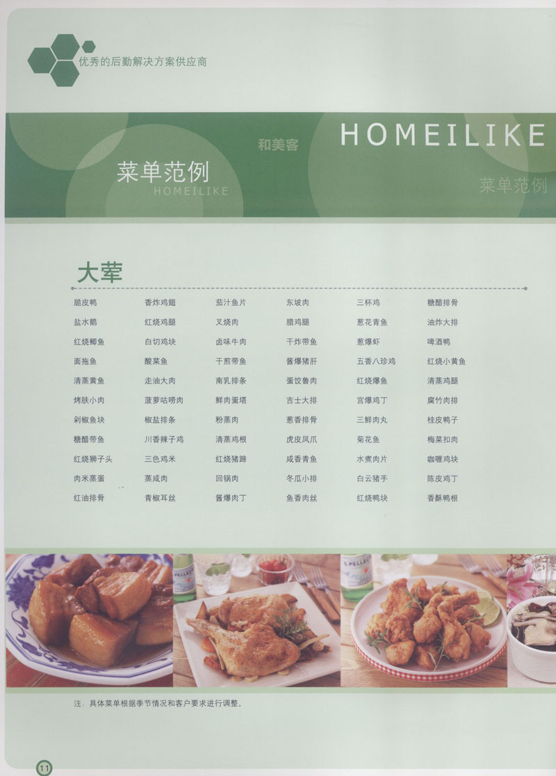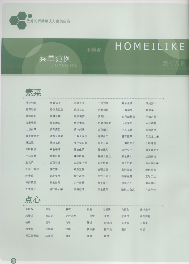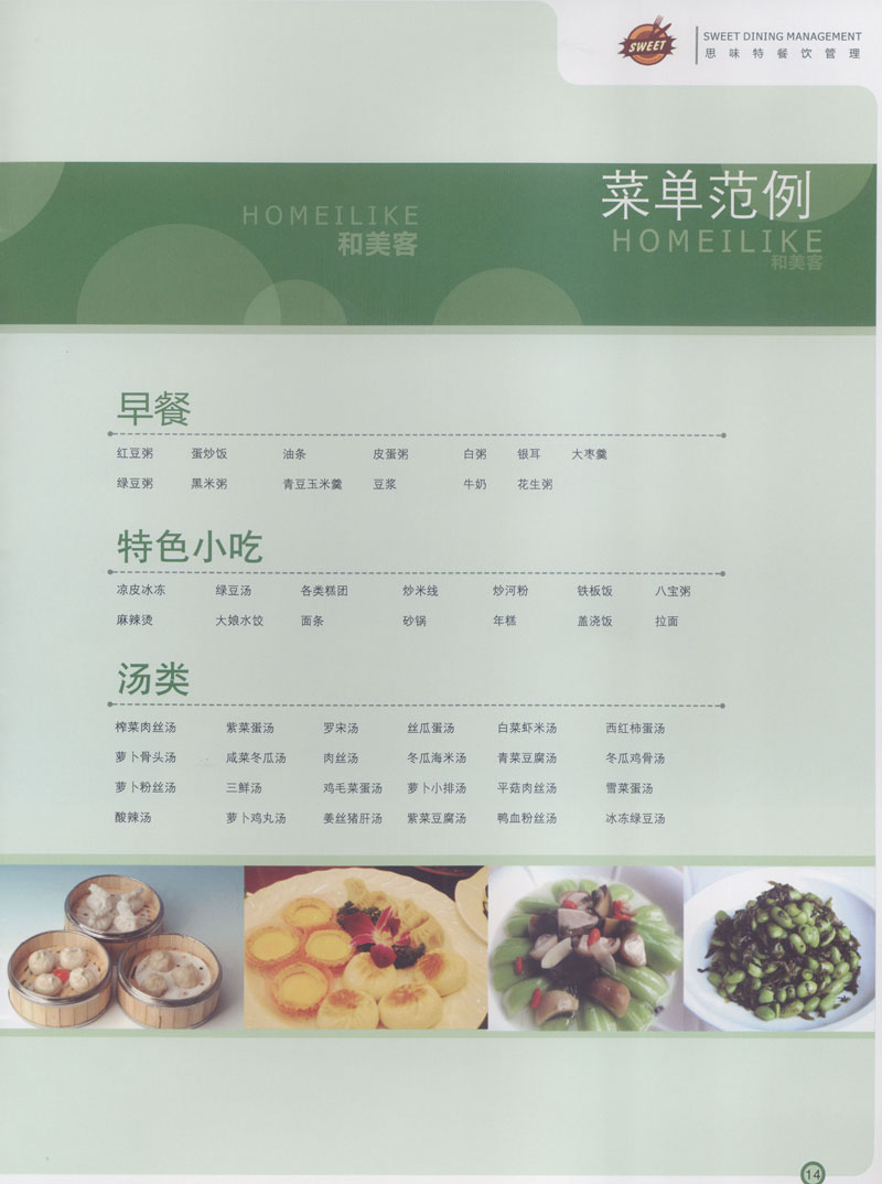 常州市思味特餐飲有限公司是一家專業(yè)從事企事業(yè)后勤服務(wù)的有限責(zé)任公司,公司從承包食堂起步,逐漸發(fā)展為經(jīng)營(yíng)團(tuán)膳承包、營(yíng)養(yǎng)送餐、生活區(qū)管理、連鎖餐廳的綜合型企業(yè)。2008年公司斥資100萬元,在常州興建了可以同時(shí)提供3000餐膳食的中央廚房,重點(diǎn)打造“和美客”后勤服務(wù)品牌,全力為企事業(yè)單位解決后勤后顧之憂。 到目前為止,我們合作成功的企事業(yè)單位超過50多家,服務(wù)人數(shù)突破15萬,合作單位包括國(guó)家機(jī)關(guān)、國(guó)有企業(yè)、三資企業(yè)、民營(yíng)企業(yè)、學(xué)校、醫(yī)院等,其中不乏國(guó)際知名品牌公司。 和美客愿為更多的國(guó)內(nèi)外企事業(yè)單位及機(jī)關(guān)團(tuán)體分憂解難,從廚房設(shè)計(jì)、菜品配送、團(tuán)膳承包、到生活區(qū)管理等提供全方位的服務(wù)。