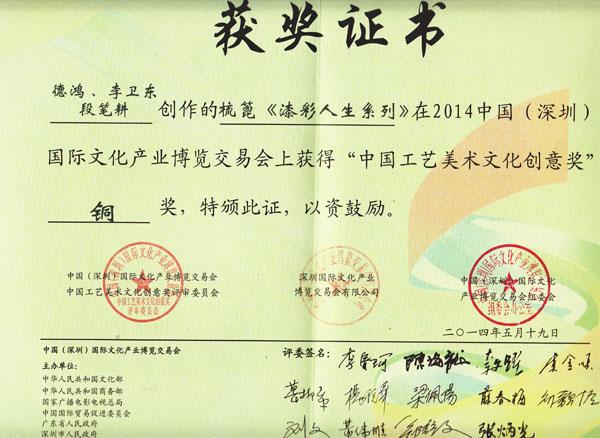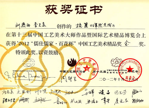公司榮譽(yù)介紹: “2009年常州市旅游商品創(chuàng)新設(shè)計(jì)大賽”,“覽盡千荷”綠檀雕刻梳榮獲三等獎(jiǎng); “2011年常州市旅游商品創(chuàng)新設(shè)計(jì)大賽”,“彩印工藝梳-我們的年代(80)”榮獲二等獎(jiǎng)。 “2011年中國(guó)包裝創(chuàng)意設(shè)計(jì)大賽“,虞美人彩印梳篦系列包裝獲得一等獎(jiǎng); “2011年中國(guó)包裝創(chuàng)意設(shè)計(jì)大賽”,虞美人筷子系列包裝獲得三等獎(jiǎng); “2011創(chuàng)意中國(guó).第五屆設(shè)計(jì)藝術(shù)大獎(jiǎng)賽”,虞美人系列包裝獲得三等獎(jiǎng); “2011首屆中國(guó)(無錫)國(guó)際文化藝術(shù)博覽會(huì)”,漆藝對(duì)梳《喜玫瑰》獲得“藝博杯“銅獎(jiǎng)。 “第十三屆中國(guó)工藝美術(shù)大師作品暨國(guó)際藝術(shù)精品博覽會(huì)”, 漆藝梳《報(bào)喜鳥》榮獲2012“儒士儒家•百花杯”中國(guó)工藝美術(shù)精品獎(jiǎng)優(yōu)秀獎(jiǎng) “第十三屆中國(guó)工藝美術(shù)大師作品暨國(guó)際藝術(shù)精品博覽會(huì)”, 虞美人《渾然天成》榮獲2012“儒士儒家•百花杯”中國(guó)工藝美術(shù)精品獎(jiǎng)金獎(jiǎng) “2012江蘇省工藝美術(shù)精品大獎(jiǎng)賽”,虞美人《S型梳》喜獲“藝博杯”銀獎(jiǎng) “第十四屆中國(guó)工藝美術(shù)大師作品暨國(guó)際藝術(shù)精品博覽會(huì)”, 虞美人工藝梳《新型十二星座梳》榮獲2013“國(guó)信•百花杯”中國(guó)工藝美術(shù)精品獎(jiǎng)優(yōu)秀獎(jiǎng) “2013【藝博杯】江蘇省工藝美術(shù)精品大獎(jiǎng)賽”,虞美人《萬事如意系列》喜獲“藝博杯”銀獎(jiǎng) “2013江蘇省工藝美術(shù)新人新作成果展作品大獎(jiǎng)賽”,虞美人《壺(福)的藝術(shù)》喜獲“藝博杯”入圍獎(jiǎng) 2013年度江蘇省“蘇商領(lǐng)袖峰會(huì)”,常州市卓尚飾品有限公司榮獲最具成長(zhǎng)性企業(yè)獎(jiǎng) 常州市卓尚飾品(虞美人)有限公司總經(jīng)理李衛(wèi)東榮獲“常州創(chuàng)意產(chǎn)業(yè)協(xié)會(huì)2013年底慈善獎(jiǎng)榮譽(yù)” 常州市卓尚飾品有限公司榮獲薛家鎮(zhèn)人民政府2013年度“創(chuàng)新創(chuàng)優(yōu)”獎(jiǎng) 常州市卓尚飾品有限公司榮獲薛家鎮(zhèn)人民政府2013年度“銷售業(yè)績(jī)”獎(jiǎng) 2014中國(guó)(深圳)國(guó)際文化產(chǎn)業(yè)博覽交易會(huì),劉燕西、李衛(wèi)東、段筆耕<十二星座系列>獲得“中國(guó)工藝美術(shù)文化創(chuàng)意獎(jiǎng)”銀獎(jiǎng) 2014中國(guó)(深圳)國(guó)際文化產(chǎn)業(yè)博覽交易會(huì),徐德鴻、李衛(wèi)東、段筆耕《漆彩人生系列》獲得“中國(guó)工藝美術(shù)文化創(chuàng)意獎(jiǎng)”銅獎(jiǎng) 文化創(chuàng)意大獎(jiǎng)賽“紫金獎(jiǎng)” ,有余(魚)系列梳篦產(chǎn)品獲得了優(yōu)秀獎(jiǎng) 2014吟飛杯首屆常州文化創(chuàng)意和設(shè)計(jì)大賽,虞美人有余(魚)系列梳篦產(chǎn)品榮獲優(yōu)秀設(shè)計(jì)獎(jiǎng) 2014吟飛杯首屆常州文化創(chuàng)意和設(shè)計(jì)大賽,虞美人“云,月”系列梳篦產(chǎn)品榮獲優(yōu)秀設(shè)計(jì)獎(jiǎng) 2014藝博杯江蘇省工藝美術(shù)精品大獎(jiǎng)賽,虞美人《梳篦:酒醉的探戈》喜獲銀獎(jiǎng) 2014“中國(guó)原創(chuàng)•百花杯”中國(guó)工藝美術(shù)精品大獎(jiǎng)賽,虞美人《梳篦-江南風(fēng)韻系列》喜獲銀獎(jiǎng) 常州市卓尚飾品有限公司獲“2014年常州市電子商務(wù)協(xié)會(huì)2014年度優(yōu)秀會(huì)員單位” 2014“虞美人”成為常州市知名商標(biāo)。
