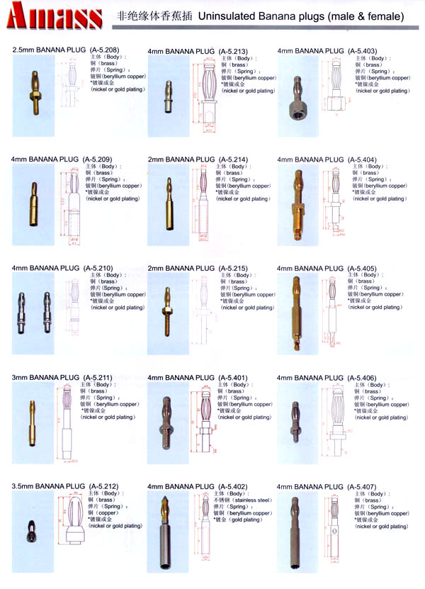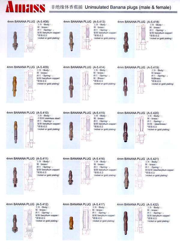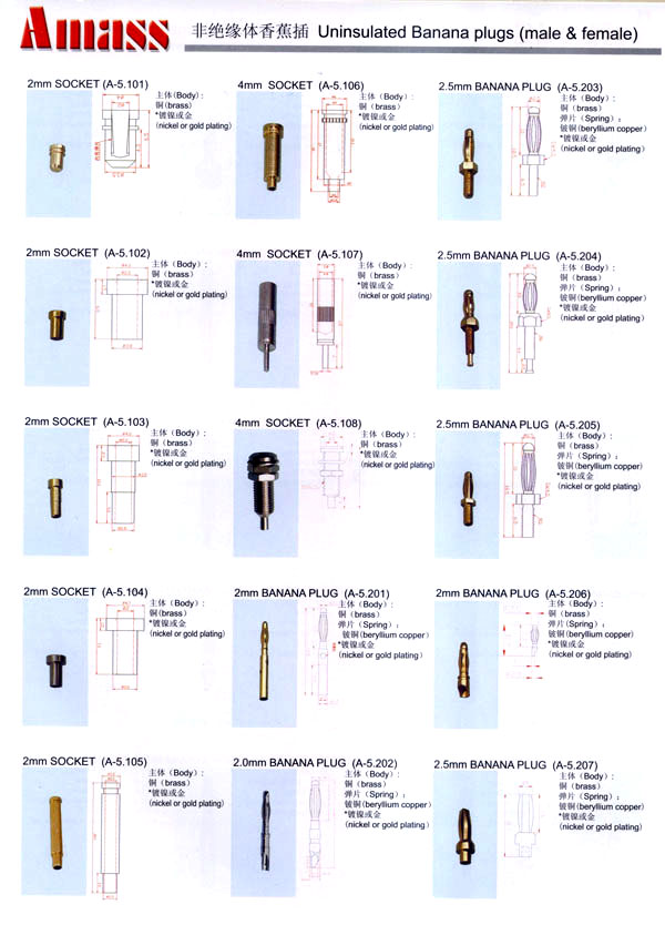 本公司專業(yè)生產(chǎn)各類香蕉插頭,香蕉插座,接線柱,電瓶夾,鱷魚夾,測試導線,測試筆等。產(chǎn)品分2mm/2.5mm/3mm/3.5mm/4mm五大系列,百余種款式, 各種香蕉插廣泛用于儀器、儀表、電力測試、教學、玩具,視聽設備、醫(yī)療儀器,保健產(chǎn)品等領域。公司技術力量雄厚,生產(chǎn)工藝先進,產(chǎn)品遠銷港、臺、歐美,并與飛利浦等國際品牌配套。公司本著精益求精的理念,歡迎新老客戶光臨。 我們擁有資深的工程師和豐富的電子產(chǎn)品銷售經(jīng)驗,專業(yè)生產(chǎn)各類電子接插件產(chǎn)品。 香蕉插頭,香蕉插座,電瓶夾,鱷魚夾等品種齊全、 質(zhì)量可靠,致力服務于通訊、數(shù)據(jù)通信、消費類電子產(chǎn)品、計算機和計算機外圍設備以及工業(yè)應用等領域,能給客戶提供全面采購解決方案。 我們秉承穩(wěn)健作風、誠實經(jīng)營、合理價格、完善服務的宗旨,在全體客戶的支持下,公司不斷創(chuàng)新進取,業(yè)績蒸蒸日上,已與數(shù)十家電子零件制造商及其分支機構建立密切合作關系,在國內(nèi)擁有數(shù)百家固定客戶。