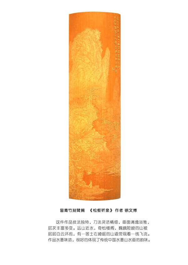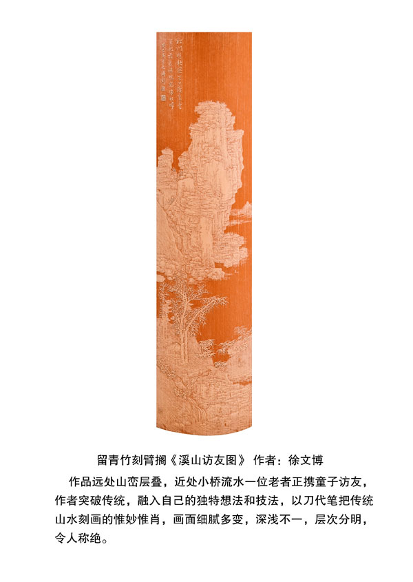 徐博(藝名文博),1973年生,江蘇武進(jìn)人,江蘇省省名人,高級(jí)工藝美術(shù)師,常州市留青竹刻非遺傳承人,常州工藝美術(shù)家協(xié)會(huì)理事,被譽(yù)為當(dāng)今中國(guó)最具創(chuàng)新意識(shí)的新銳竹刻家代表,多次獲得國(guó)家工藝美術(shù)大獎(jiǎng)?釔(ài)留青竹刻的徐文博賞竹為樂(lè),以竹詠志,借竹抒懷,悉心探索留青竹刻的藝術(shù)表現(xiàn)。在中國(guó)工藝美術(shù)大師蕭劍波的精心指導(dǎo)下,開(kāi)創(chuàng)留青水墨山水之技法,更好的體現(xiàn)了竹刻淡雅清秀的藝術(shù)風(fēng)格,并不斷汲取書(shū)畫、攝影、雕塑等藝術(shù)精華,不斷滋養(yǎng)藝術(shù)情趣,提升擴(kuò)展胸襟人格的同時(shí)也逐步形成了其形神兼?zhèn),虛?shí)相生,氣韻生動(dòng)的藝術(shù)特點(diǎn),作品為眾多的國(guó)內(nèi)外收藏家珍藏。