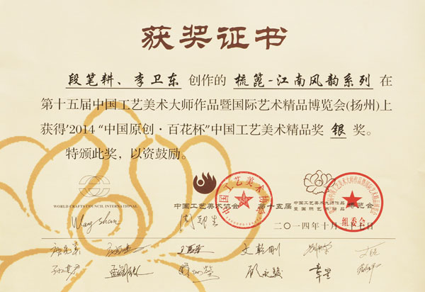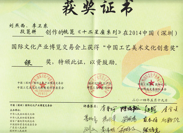 公司榮譽(yù)介紹: “2009年常州市旅游商品創(chuàng)新設(shè)計(jì)大賽”,“覽盡千荷”綠檀雕刻梳榮獲三等獎; “2011年常州市旅游商品創(chuàng)新設(shè)計(jì)大賽”,“彩印工藝梳-我們的年代(80)”榮獲二等獎。 “2011年中國包裝創(chuàng)意設(shè)計(jì)大賽“,虞美人彩印梳篦系列包裝獲得一等獎; “2011年中國包裝創(chuàng)意設(shè)計(jì)大賽”,虞美人筷子系列包裝獲得三等獎; “2011創(chuàng)意中國.第五屆設(shè)計(jì)藝術(shù)大獎賽”,虞美人系列包裝獲得三等獎; “2011首屆中國(無錫)國際文化藝術(shù)博覽會”,漆藝對梳《喜玫瑰》獲得“藝博杯“銅獎。 “第十三屆中國工藝美術(shù)大師作品暨國際藝術(shù)精品博覽會”, 漆藝梳《報(bào)喜鳥》榮獲2012“儒士儒家•百花杯”中國工藝美術(shù)精品獎優(yōu)秀獎 “第十三屆中國工藝美術(shù)大師作品暨國際藝術(shù)精品博覽會”, 虞美人《渾然天成》榮獲2012“儒士儒家•百花杯”中國工藝美術(shù)精品獎金獎 “2012江蘇省工藝美術(shù)精品大獎賽”,虞美人《S型梳》喜獲“藝博杯”銀獎 “第十四屆中國工藝美術(shù)大師作品暨國際藝術(shù)精品博覽會”, 虞美人工藝梳《新型十二星座梳》榮獲2013“國信•百花杯”中國工藝美術(shù)精品獎優(yōu)秀獎 “2013【藝博杯】江蘇省工藝美術(shù)精品大獎賽”,虞美人《萬事如意系列》喜獲“藝博杯”銀獎 “2013江蘇省工藝美術(shù)新人新作成果展作品大獎賽”,虞美人《壺(福)的藝術(shù)》喜獲“藝博杯”入圍獎 2013年度江蘇省“蘇商領(lǐng)袖峰會”,常州市卓尚飾品有限公司榮獲最具成長性企業(yè)獎 常州市卓尚飾品(虞美人)有限公司總經(jīng)理李衛(wèi)東榮獲“常州創(chuàng)意產(chǎn)業(yè)協(xié)會2013年底慈善獎榮譽(yù)” 常州市卓尚飾品有限公司榮獲薛家鎮(zhèn)人民政府2013年度“創(chuàng)新創(chuàng)優(yōu)”獎 常州市卓尚飾品有限公司榮獲薛家鎮(zhèn)人民政府2013年度“銷售業(yè)績”獎 2014中國(深圳)國際文化產(chǎn)業(yè)博覽交易會,劉燕西、李衛(wèi)東、段筆耕<十二星座系列>獲得“中國工藝美術(shù)文化創(chuàng)意獎”銀獎 2014中國(深圳)國際文化產(chǎn)業(yè)博覽交易會,徐德鴻、李衛(wèi)東、段筆耕《漆彩人生系列》獲得“中國工藝美術(shù)文化創(chuàng)意獎”銅獎 文化創(chuàng)意大獎賽“紫金獎” ,有余(魚)系列梳篦產(chǎn)品獲得了優(yōu)秀獎 2014吟飛杯首屆常州文化創(chuàng)意和設(shè)計(jì)大賽,虞美人有余(魚)系列梳篦產(chǎn)品榮獲優(yōu)秀設(shè)計(jì)獎 2014吟飛杯首屆常州文化創(chuàng)意和設(shè)計(jì)大賽,虞美人“云,月”系列梳篦產(chǎn)品榮獲優(yōu)秀設(shè)計(jì)獎 2014藝博杯江蘇省工藝美術(shù)精品大獎賽,虞美人《梳篦:酒醉的探戈》喜獲銀獎 2014“中國原創(chuàng)•百花杯”中國工藝美術(shù)精品大獎賽,虞美人《梳篦-江南風(fēng)韻系列》喜獲銀獎 常州市卓尚飾品有限公司獲“2014年常州市電子商務(wù)協(xié)會2014年度優(yōu)秀會員單位” 2014“虞美人”成為常州市知名商標(biāo)。