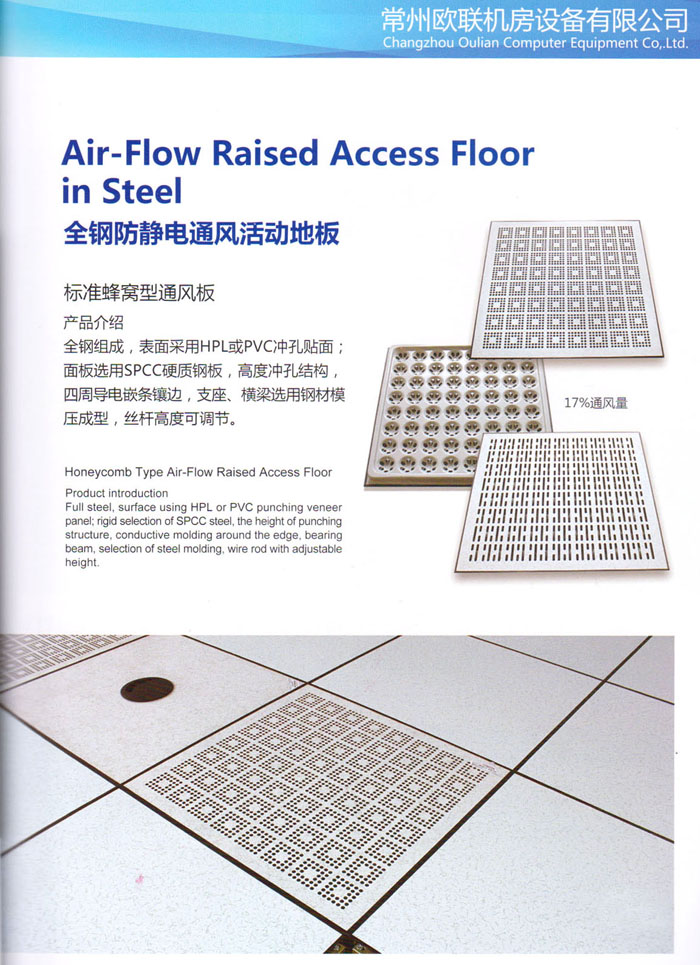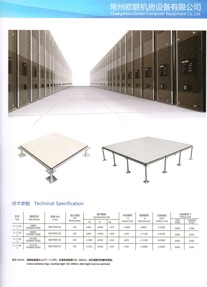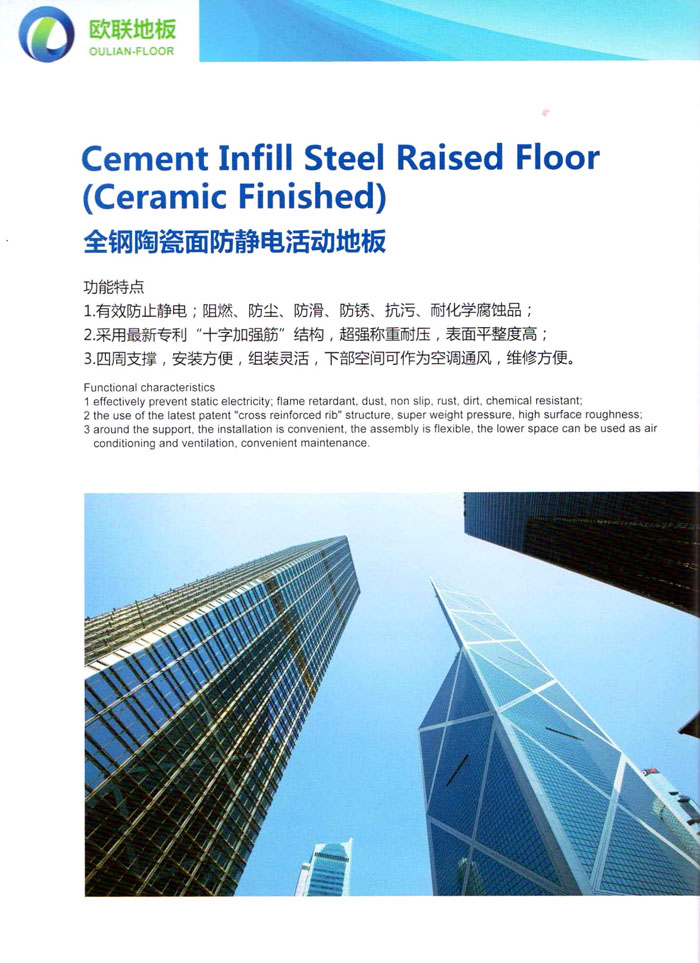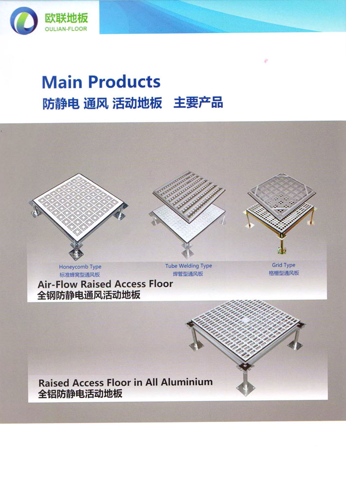 防靜電高架活動(dòng)地板、全鋼地板、陶瓷地板是計(jì)算機(jī)行業(yè)發(fā)展起來(lái)的新型鋪地材料,隔離了潮氣、靜電灰塵,最重要的是解決了綜合布線問(wèn)題,無(wú)需預(yù)埋管線,可隨時(shí)拆卸、搬移,保證了資訊設(shè)備完整的優(yōu)點(diǎn),適應(yīng)了智能化樓宇中信息自動(dòng)化技術(shù)對(duì)所處環(huán)境的特定要求,避免了廣大客戶的雙重投資,使現(xiàn)代化辦公程度更加高效,辦公場(chǎng)所更加舒適。 “歐聯(lián)”系列全鋼地板,符合國(guó)家安全要求,種類完備多樣,其中防靜電陶瓷地板、硫酸鈣地板等除具有普通瓷質(zhì)的裝飾和實(shí)用性外,其耐磨、防水、防火功能優(yōu)于其它同類產(chǎn)品,防靜電系列地板,能切合不同客戶的要求,其靈活的配置,深受客戶歡迎,不同材質(zhì)的地板結(jié)構(gòu)使設(shè)計(jì)師的設(shè)計(jì)空間比傳統(tǒng)的更加廣闊自由和善變。 公司大力發(fā)展國(guó)內(nèi)外銷售業(yè)務(wù),多次中標(biāo)國(guó)內(nèi)重點(diǎn)工程 ,例:哈爾濱醫(yī)科大學(xué)、山東大學(xué)、上海普通機(jī)場(chǎng)等。 公司將一如既往開(kāi)發(fā)和制造一流的產(chǎn)品,愿與廣大有識(shí)之士合作發(fā)展,共創(chuàng)美好未來(lái)。