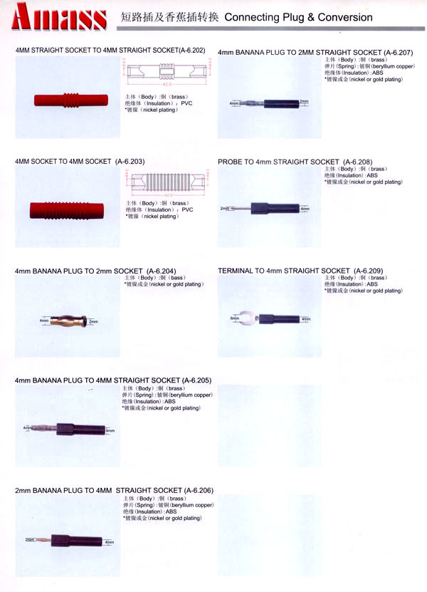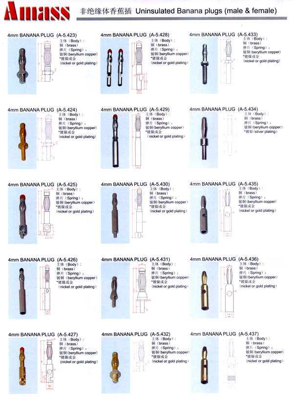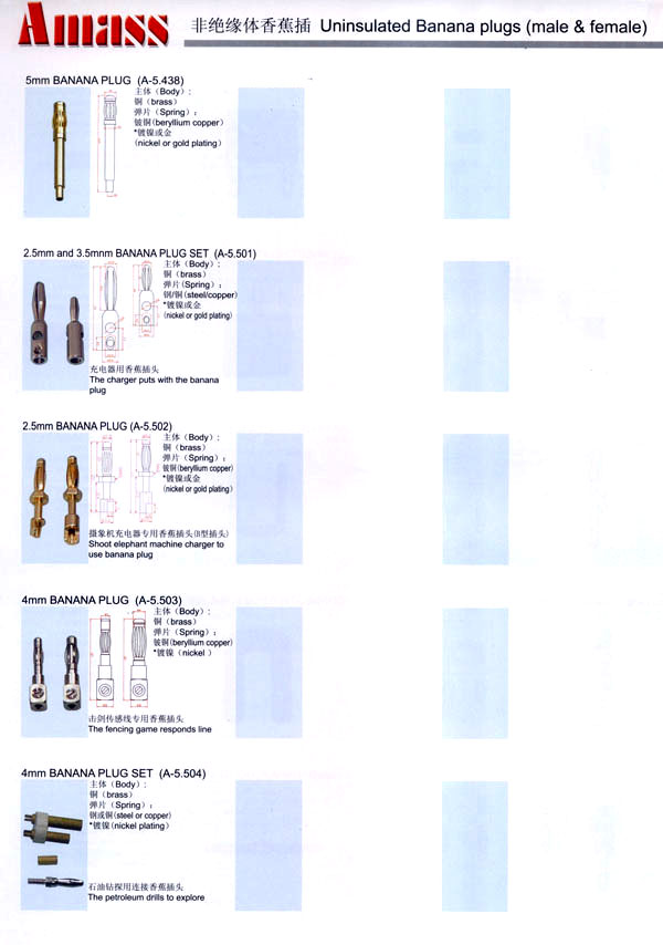 本公司專業(yè)生產(chǎn)各類香蕉插頭,香蕉插座,接線柱,電瓶夾,鱷魚夾,測試導(dǎo)線,測試筆等。產(chǎn)品分2mm/2.5mm/3mm/3.5mm/4mm五大系列,百余種款式, 各種香蕉插廣泛用于儀器、儀表、電力測試、教學(xué)、玩具,視聽設(shè)備、醫(yī)療儀器,保健產(chǎn)品等領(lǐng)域。公司技術(shù)力量雄厚,生產(chǎn)工藝先進(jìn),產(chǎn)品遠(yuǎn)銷港、臺、歐美,并與飛利浦等國際品牌配套。公司本著精益求精的理念,歡迎新老客戶光臨。 我們擁有資深的工程師和豐富的電子產(chǎn)品銷售經(jīng)驗,專業(yè)生產(chǎn)各類電子接插件產(chǎn)品。 香蕉插頭,香蕉插座,電瓶夾,鱷魚夾等品種齊全、 質(zhì)量可靠,致力服務(wù)于通訊、數(shù)據(jù)通信、消費類電子產(chǎn)品、計算機和計算機外圍設(shè)備以及工業(yè)應(yīng)用等領(lǐng)域,能給客戶提供全面采購解決方案。 我們秉承穩(wěn)健作風(fēng)、誠實經(jīng)營、合理價格、完善服務(wù)的宗旨,在全體客戶的支持下,公司不斷創(chuàng)新進(jìn)取,業(yè)績蒸蒸日上,已與數(shù)十家電子零件制造商及其分支機構(gòu)建立密切合作關(guān)系,在國內(nèi)擁有數(shù)百家固定客戶。