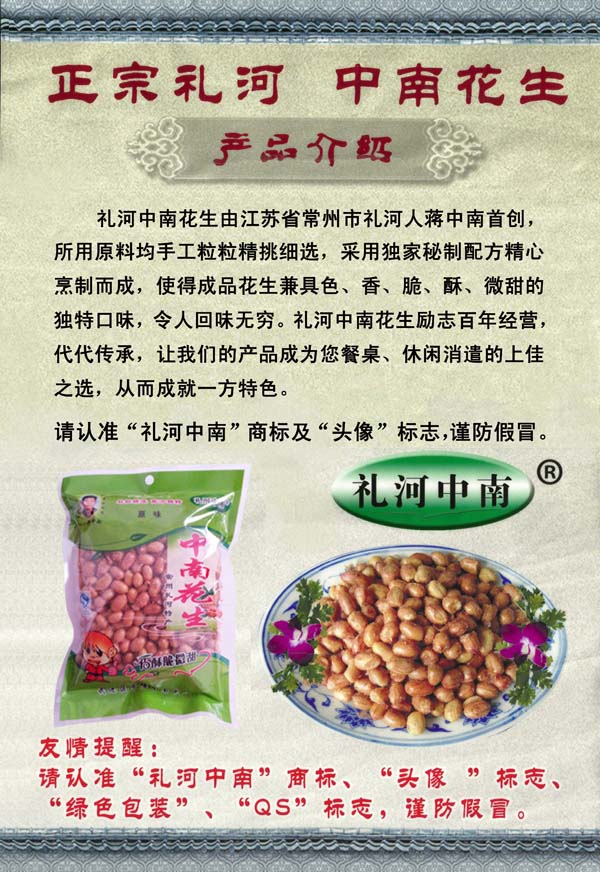武進(jìn)區(qū)牛塘中南食品廠的是由原“禮河中南”花生發(fā)展而成。"禮河中南"花生由常州禮河人蔣中南首創(chuàng)。所采用的花生,選用優(yōu)質(zhì)的產(chǎn)地,經(jīng)過(guò)人工精心挑選,把不規(guī)則的粒子去掉,加上獨(dú)家的配方和精工制作,使花生香、酥、脆、微甜。獨(dú)特的口味,令人吃了回味無(wú)窮,在常武地區(qū)享有盛譽(yù)、暢銷(xiāo)不衰。 隨著“禮河中南“花生在常武地區(qū)的暢銷(xiāo),企業(yè)不斷的發(fā)展壯大,逐漸發(fā)展成為一個(gè)專(zhuān)業(yè)生產(chǎn)加工油炸花生的公司,擁有完整、科學(xué)的質(zhì)量管理體系。武進(jìn)牛塘中南花生食品廠設(shè)備齊全、環(huán)境干凈整潔、資質(zhì)齊全,企業(yè)的誠(chéng)信、實(shí)力和產(chǎn)品質(zhì)量獲得業(yè)界的認(rèn)可。 正宗的中南花生為綠色包裝,包裝上有“禮河中南”花生創(chuàng)始人蔣中南先生的頭像以及QS生產(chǎn)許可標(biāo)志,請(qǐng)廣大客戶(hù)認(rèn)準(zhǔn)購(gòu)買(mǎi),以防假冒。 歡迎各界朋友蒞臨參觀、指導(dǎo)和業(yè)務(wù)洽談。 制造商:常州市武進(jìn)區(qū)牛塘中南食品廠 銷(xiāo)售店:常州市武進(jìn)區(qū)禮河聚新家園商業(yè)街12-8號(hào) 常州市武進(jìn)區(qū)湖塘鎮(zhèn)東方路53號(hào)(陸家橋西側(cè))