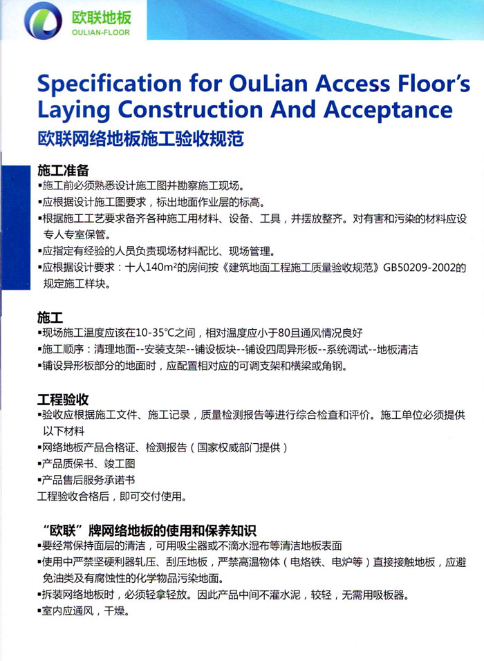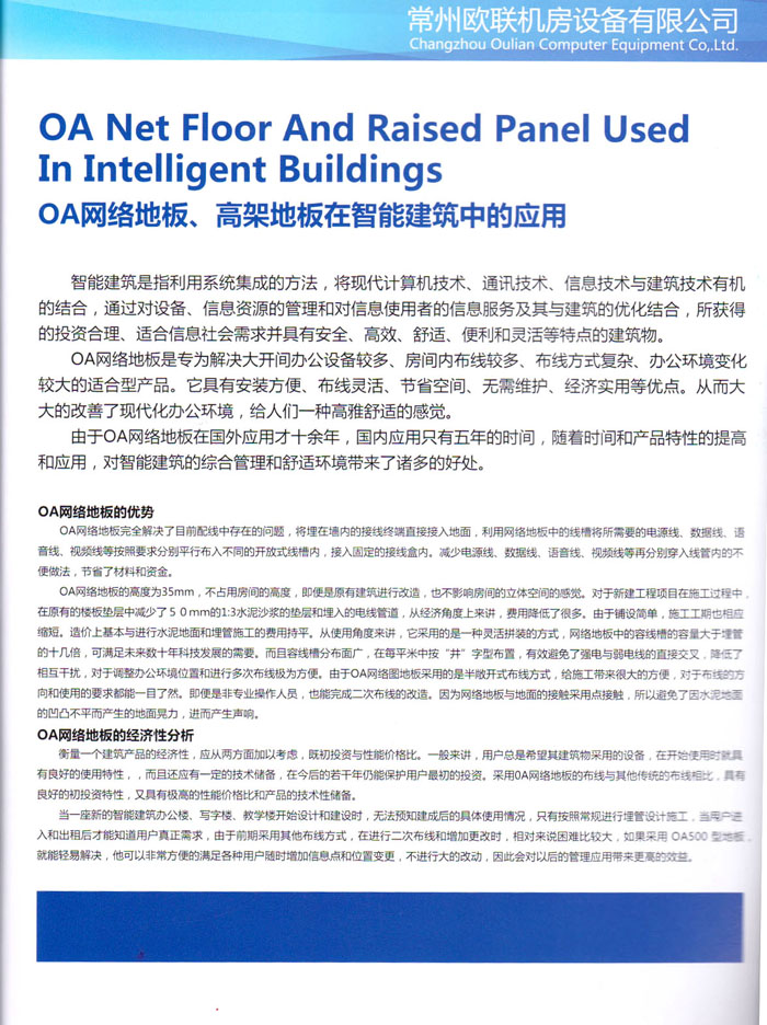 防靜電高架活動(dòng)地板、全鋼地板、陶瓷地板是計(jì)算機(jī)行業(yè)發(fā)展起來(lái)的新型鋪地材料,隔離了潮氣、靜電灰塵,最重要的是解決了綜合布線問(wèn)題,無(wú)需預(yù)埋管線,可隨時(shí)拆卸、搬移,保證了資訊設(shè)備完整的優(yōu)點(diǎn),適應(yīng)了智能化樓宇中信息自動(dòng)化技術(shù)對(duì)所處環(huán)境的特定要求,避免了廣大客戶(hù)的雙重投資,使現(xiàn)代化辦公程度更加高效,辦公場(chǎng)所更加舒適。 “歐聯(lián)”系列全鋼地板,符合國(guó)家安全要求,種類(lèi)完備多樣,其中防靜電陶瓷地板、硫酸鈣地板等除具有普通瓷質(zhì)的裝飾和實(shí)用性外,其耐磨、防水、防火功能優(yōu)于其它同類(lèi)產(chǎn)品,防靜電系列地板,能切合不同客戶(hù)的要求,其靈活的配置,深受客戶(hù)歡迎,不同材質(zhì)的地板結(jié)構(gòu)使設(shè)計(jì)師的設(shè)計(jì)空間比傳統(tǒng)的更加廣闊自由和善變。 公司大力發(fā)展國(guó)內(nèi)外銷(xiāo)售業(yè)務(wù),多次中標(biāo)國(guó)內(nèi)重點(diǎn)工程 ,例:哈爾濱醫(yī)科大學(xué)、山東大學(xué)、上海普通機(jī)場(chǎng)等。 公司將一如既往開(kāi)發(fā)和制造一流的產(chǎn)品,愿與廣大有識(shí)之士合作發(fā)展,共創(chuàng)美好未來(lái)。
